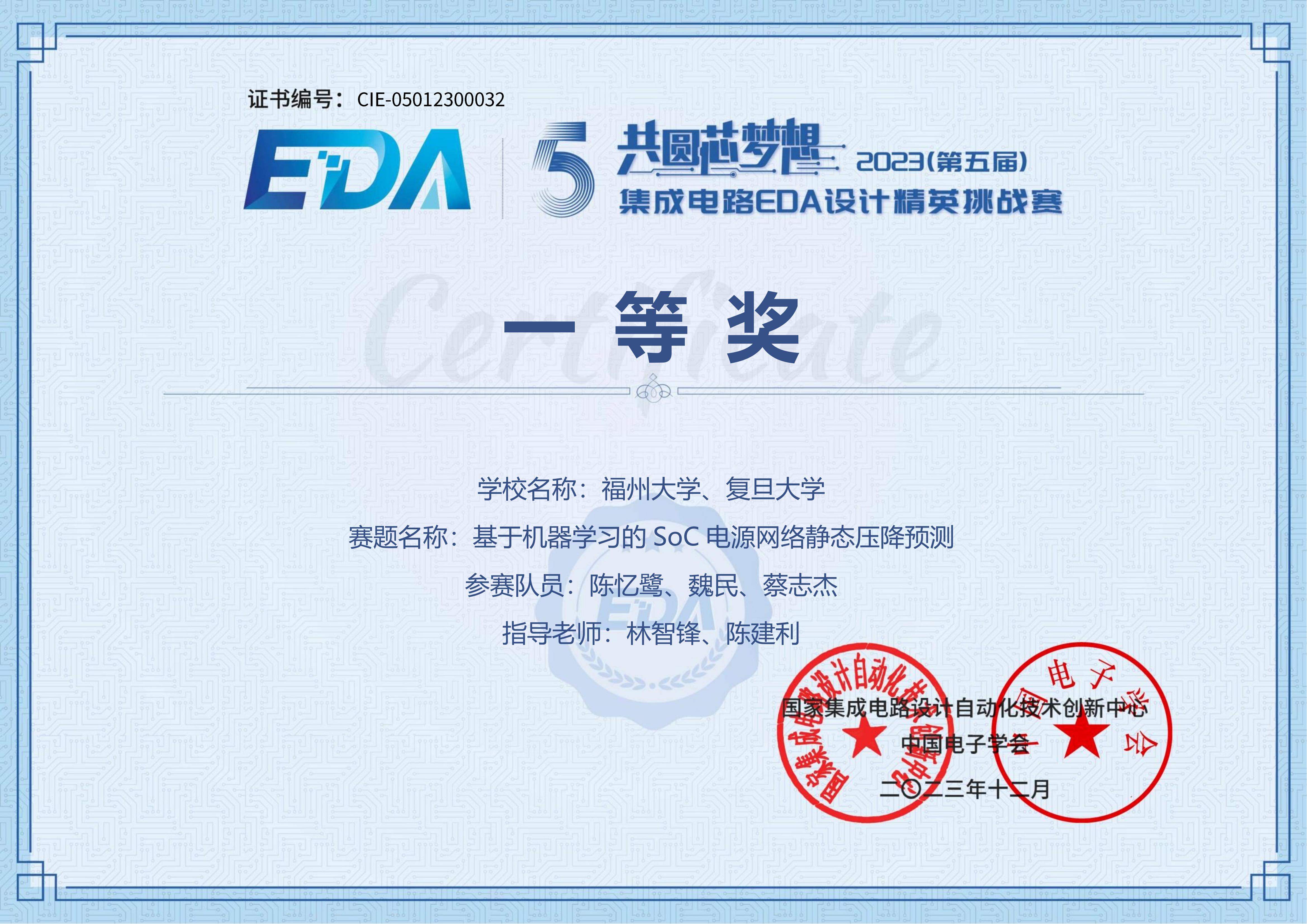 2021级博士生陈忆鹭作为队长与复旦大学组成的联队以赛题第一名的成绩获得了行芯赛题的全国一等奖,同时获得了行芯科技企业特别奖,在此向获奖者和指导老师表示热烈祝贺!