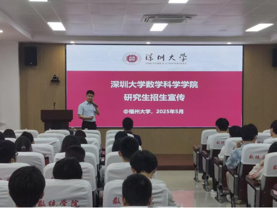 宣讲会上,胡教授以专业视角全面解读了深圳大学数学科学学院的研究生培养体系,着重强调了该校作为特区高校所具备的区位优势,以及其国际化校园环境和独特的学科发展特色,并围绕数学学科前沿方向、导师团队建设、研究生培养模式等展开深入阐释。通过详实的数据与典型案例,胡教授不仅为参会学生清晰地勾勒出升学路径,还充分展现了该学院在基础数学、应用数学等领域的科研实力与人才培养成效。