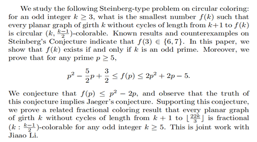 报告题目:Circular Coloring and Fractional Coloring in Planar Graphs