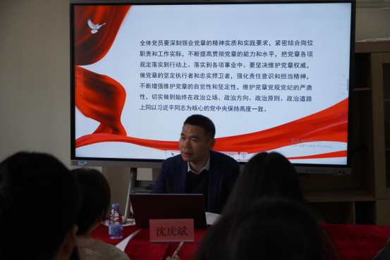 沈庆斌书记强调,新征程上,我们要深刻认识党章的地位和作用,重点讲述我们不仅要看到党员的权力更要看到党员的义务,分点详细讲述了作为学生党员如何更好地履行党员的八项义务。与此同时,沈书记带领我们掌握二十大党章修改的主要内容,教导我们准确把握学习贯彻二十大党章修正案的实践要求,要深入领会党的二十大党章修改的重大意义,更加自觉地学习党章、遵守党章,切实贯彻党章、坚决维护党章。最后,沈庆斌书记引用毛泽东为陕北公学成立的题词深情寄语在座的同学们,希望同学们成为有理想、敢担当、能吃苦、肯奋斗的新时代好青年。