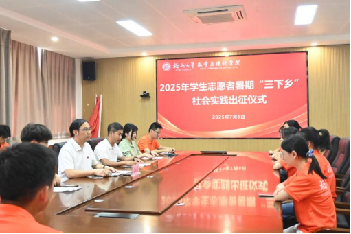 2025年学生志愿者暑期“三下乡”社会实践活动出征仪式在数统楼312会议室举行。学院党委副书记蓝荣聪、辅导员许佳琦以及实践队学生志愿者代表出席本次出征仪式。仪式由院团委副书记沈成平主持。
