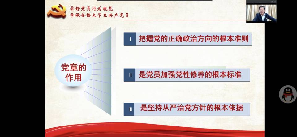 内容由三部分组成:一,《党章》与党员行为;二,遵守党员行为规范《党章》;三,如何成长为合格的大学生党员。