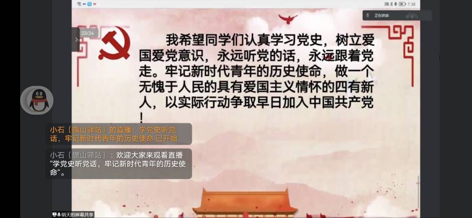 最后,老师强调,青年人比以往任何时候都有做中国人的志气、骨气、底气,希望同学们认真学习党史,树立爱国爱党意识,永远跟着党走。牢记新时代青年的历史使命,做一个无愧于人民的具有爱国主义情怀的四有新人,以实际行动争取早日加入中国共产党!