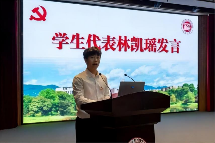 由学生代表林凯瑶同学发言。首先林凯瑶同学代表所有发展对象对各级党组织的关怀与支持表示衷心的感谢。林凯瑶同学提到在当今世界正处于百年未有之大变局,作为未来的新时代党员,我们要勇立时代潮头,走在时代前列,为党和人民贡献青春力量。林凯瑶同学希望同学们向优秀党员看齐,用党员的标准要求自己,坚定党的精神信念,内化于心、外化于行,传承先辈的奋斗精神,推动中国这艘东方巨轮在历史洪流中再创辉煌。