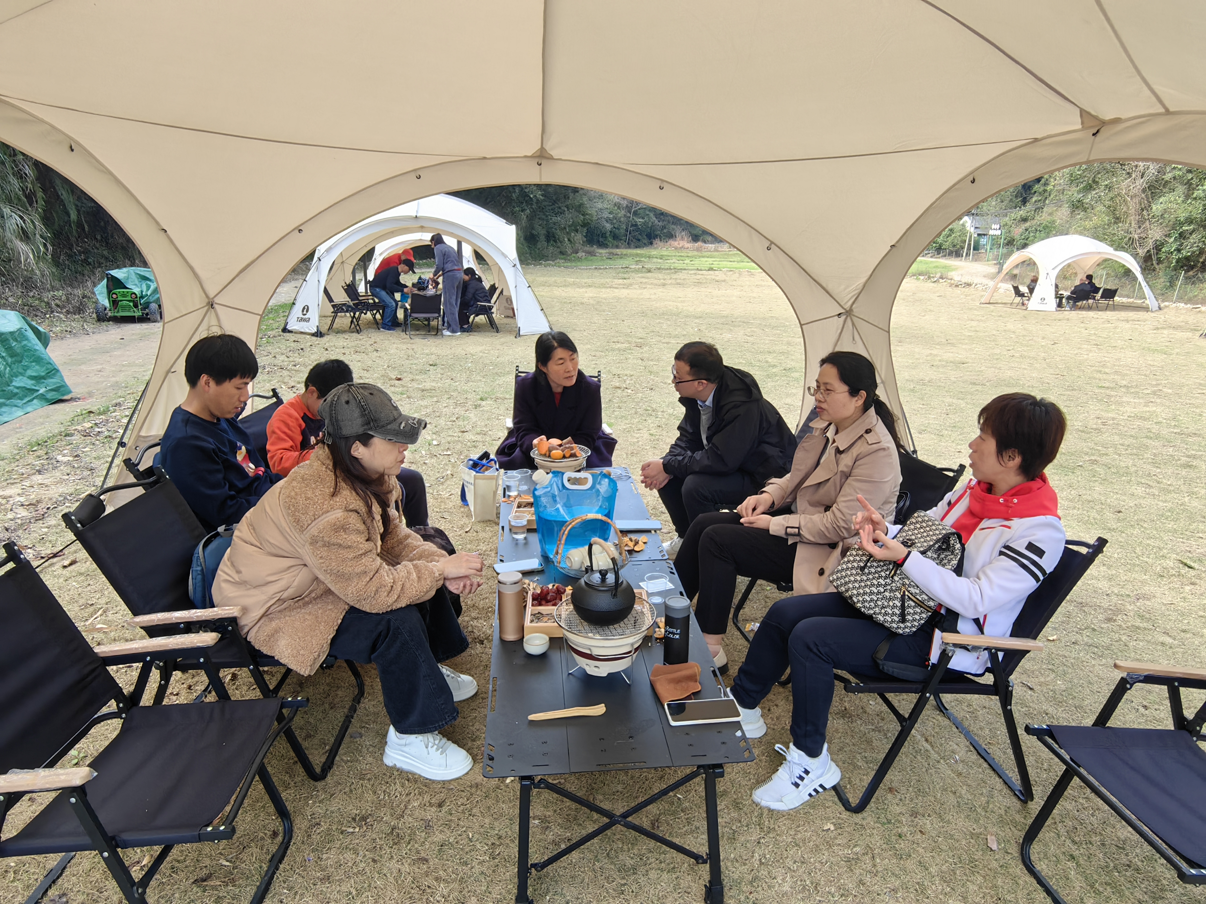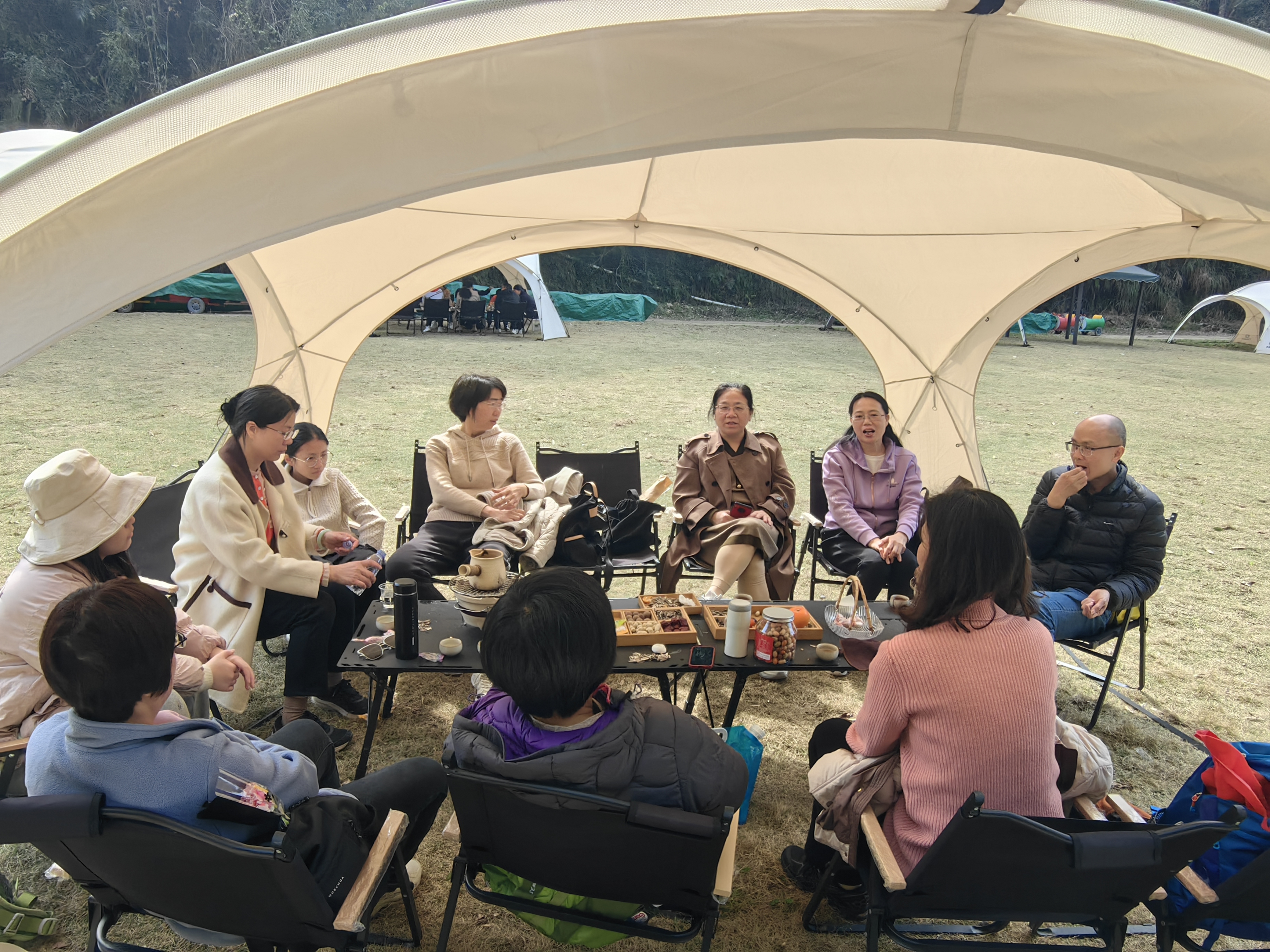 午后和煦阳光、微风轻拂,大草坪上点缀着天幕,如草原上的蒙古包,令人赏心悦目。教职工们围炉煮茶,相谈甚欢,共享欢乐时光。
