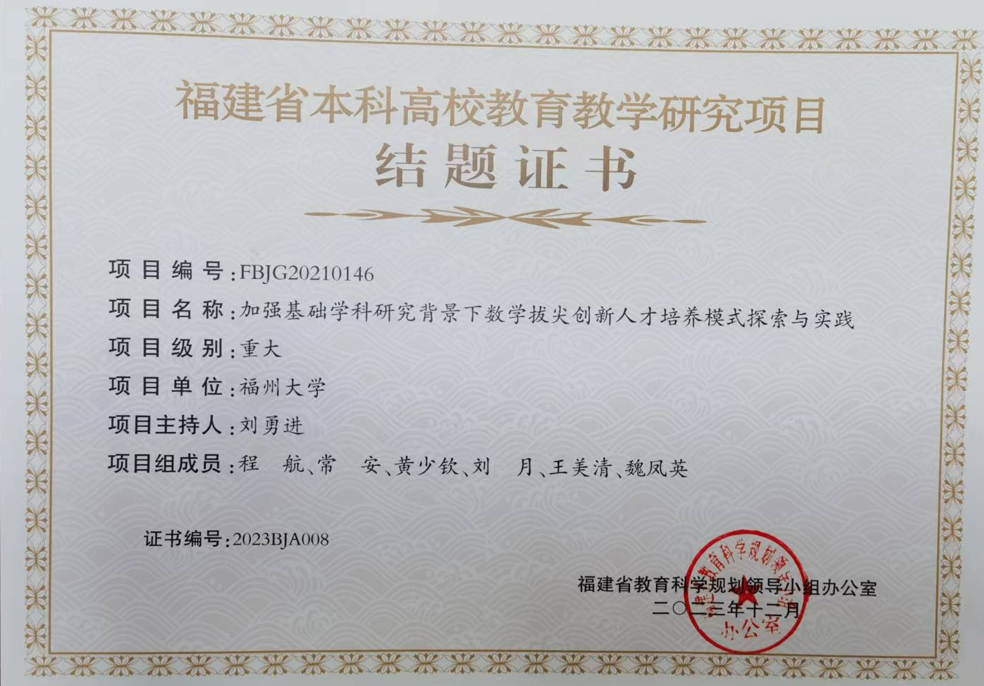 科研成果1:加强基础学科研究背景下数学拔尖创新人才培养模式探索与实践,获批福建省本科高校教育教学改革研究项目重大立项。该项目对针对数学人才培养模式中课程思政融入、个性化教学、培养模式、育人机制等问题进行深入研究,以数学基础学科拔尖学生培养实验班为抓手,在原有“数理综合班”和“数理金融班”数学交叉人才培养实验班的基础上,整合现有相关的优质科教资源,推进落实数学创新人才计划。
